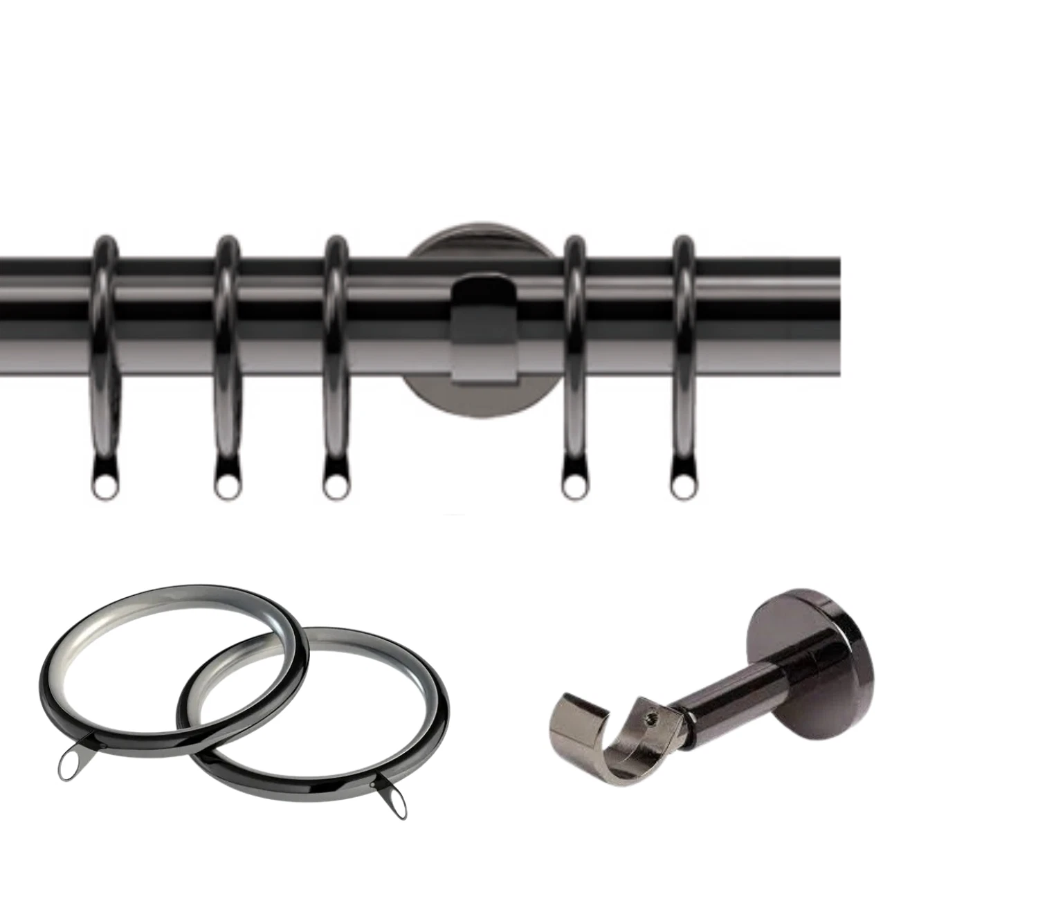 This is a semi-complete curtain pole set available in four plated finishes and one powder-coated finish. It is designed for heading-tape curtains, but you can also use tab-top or eyelet curtains by simply removing the curtain rings.