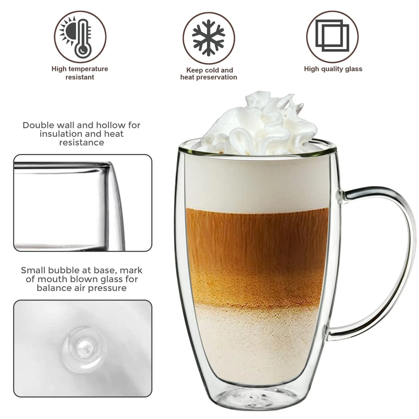 2x Double Wall Glass Coffee & Tea Mugs 450ml – Insulated, Clear with Handle