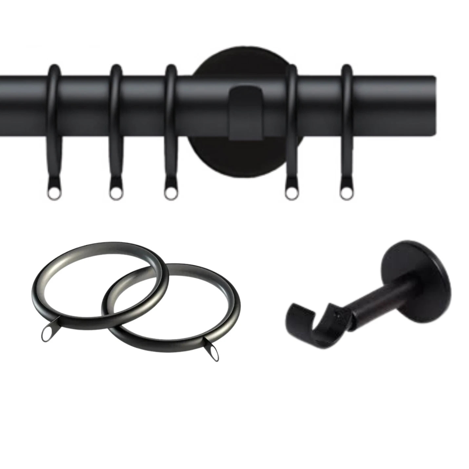 35mm Matt Black Semi-Complete Curtain Poles with IDC Brackets, Lined Rings