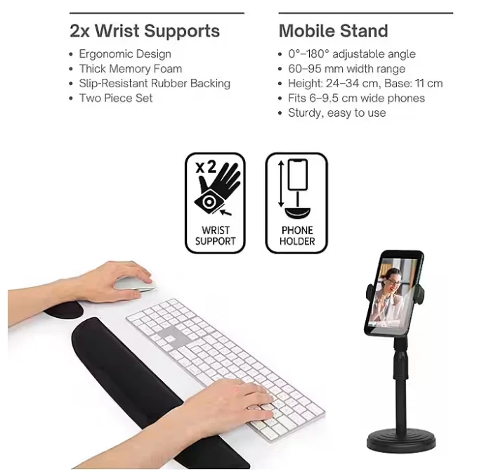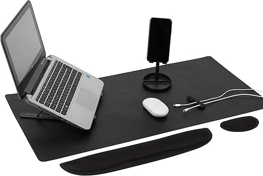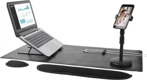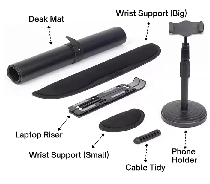 Great for organising your space, this set is complete with a phone holder, laptop riser, desk mat, two wrist supports and a cable tidy.