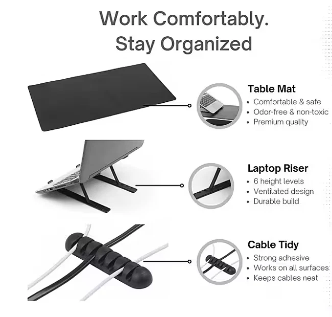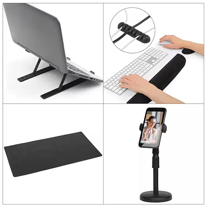 Included components: 1 phone holder, 1 laptop riser, 1 desk pad, 2 wrist rests, 1 cable wrap