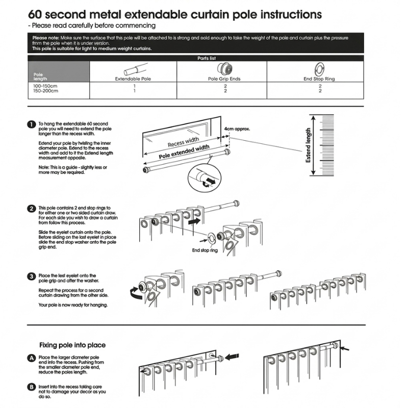 - The 60 second extendable curtain pole is for a recess fit only.