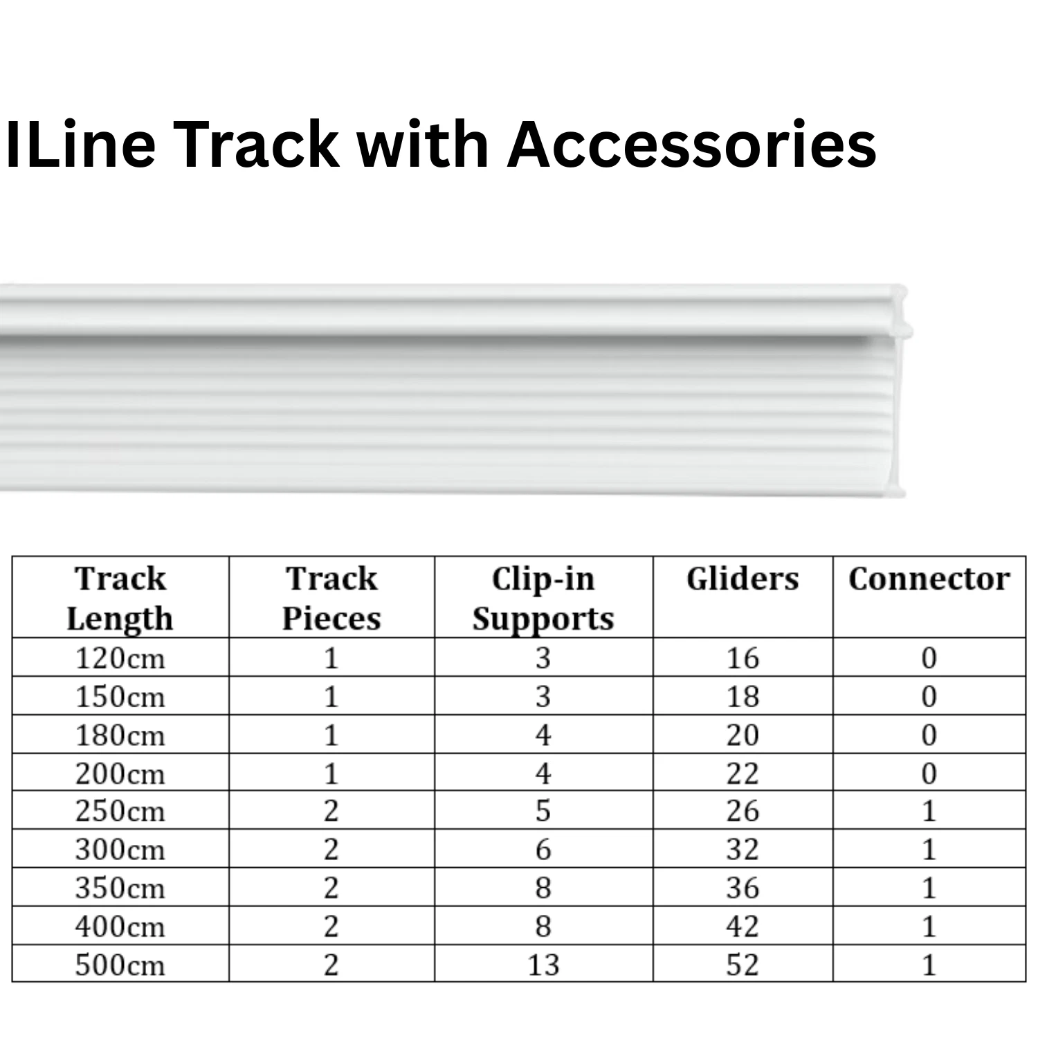 120 cm I Line Track, 150 cm I Line Track, 180 cm I Line Track, 200 cm I Line Track, 200 cm I Line Track, 250 cm I Line Track, 300 cm I Line Track, 350 cm I Line Track, 400 cm I Line Track, 500 cm I Line Track, I Line Gliders (Pk of 10), I Line Magnetic Glider Pk 4, I Line End Cover (Pk of 10), Pro 107mm Face Fix Support Pk4, I Line Connector