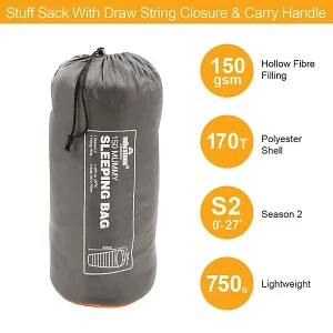 This single mummy sleeping bag is a lightweight and practical choice for camping trips, festivals, and outdoor adventures, offering comfort and warmth from late spring to early autumn. Designed with a drawstring hood for added insulation, a double-sided zipper for easy access, and a secure neckline fastening to prevent slipping, it ensures a snug and restful night’s sleep. The 150gsm hollow fibre filling and durable 170T polyester shell provide warmth and water resistance, while the included drawstring carry bag allows for compact storage and easy transport.