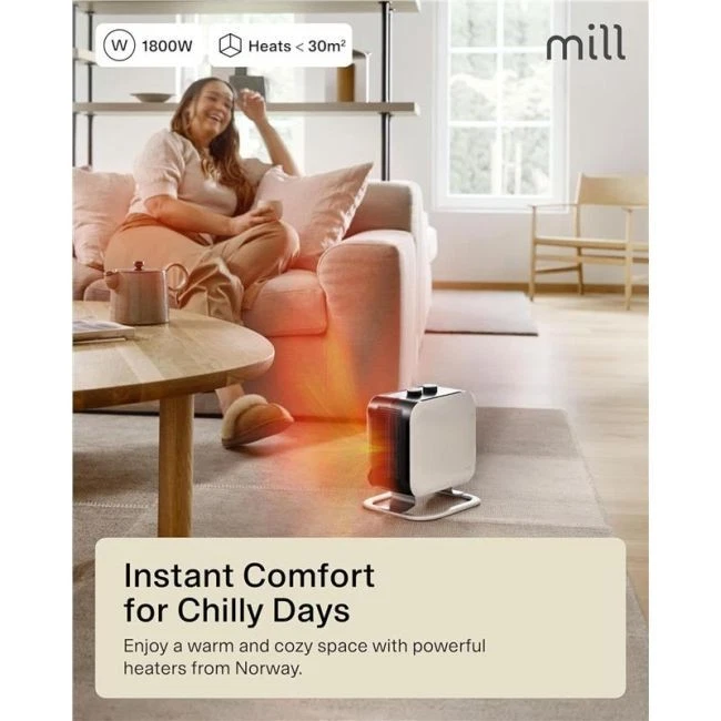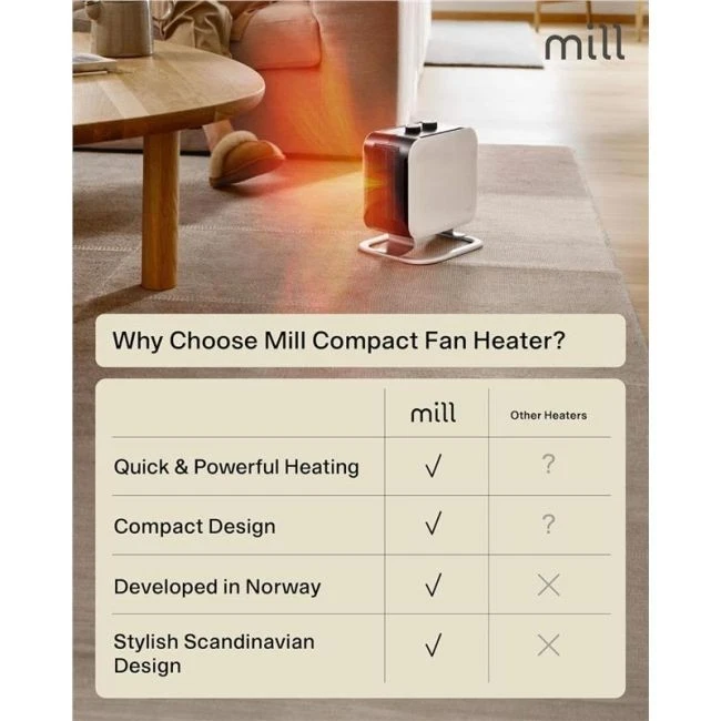 The Mill Compact Fan Heater 1800W is a lightweight, stylish, and powerful PTC ceramic heater designed to efficiently heat small to medium rooms (5–30m²). With rapid fan-forced heating and a sleek Scandinavian design created in Norway, it delivers safe, comfortable warmth while blending seamlessly into modern interiors.