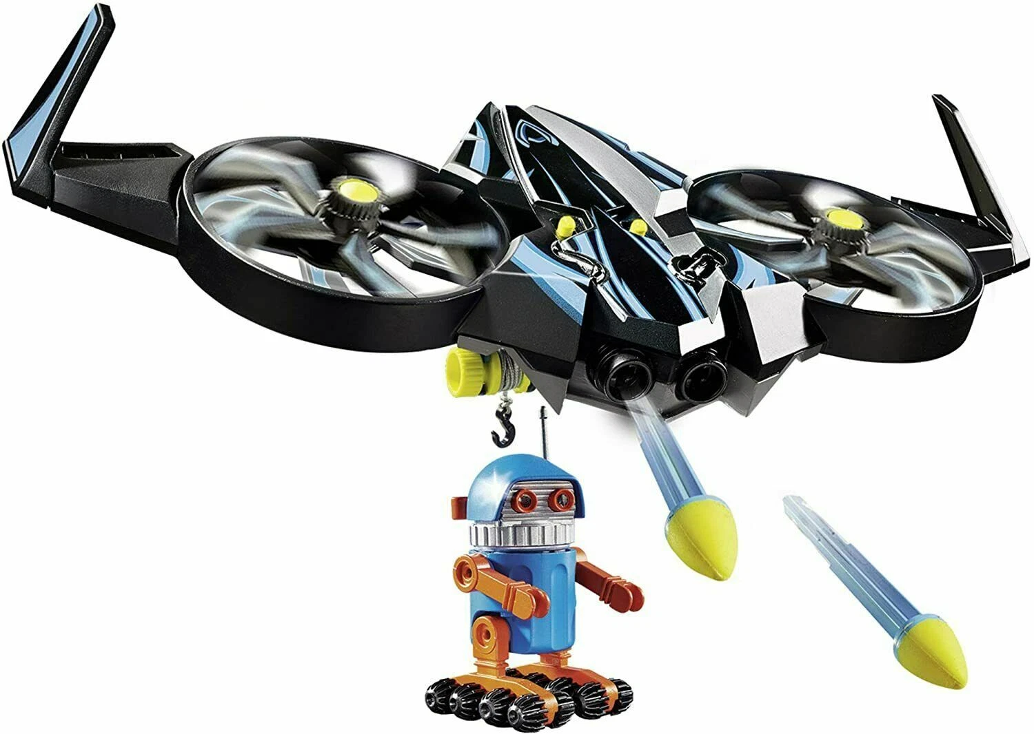 Drone fires arrow projectiles; Robotitron has gripping hand