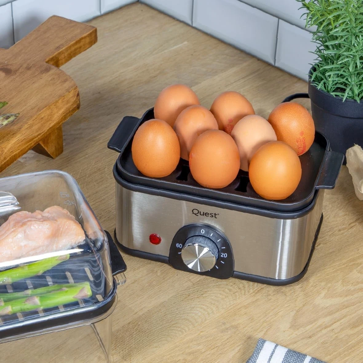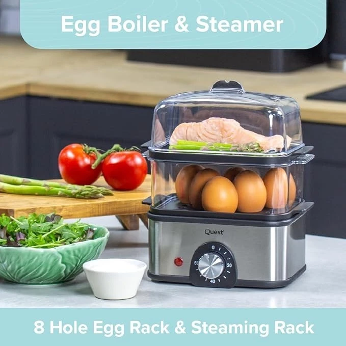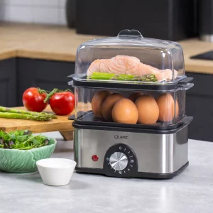 Home Electricals Quest 2-Tier Stainless Steel Egg Cooker – 8-Hole Egg Boiler, Poacher & Food Steamer