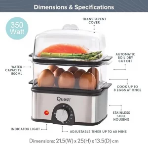 with a transparent plastic cover for easy monitoring. Its 2-tier design doubles as a food steamer, allowing you to steam vegetables, meats, and more, making it perfect for smaller kitchens with a compact footprint of just H25 x W21.5 x D13.5cm. Crafted with durable stainless steel housing, the steamer is easy to clean and features cool-touch handles on the trays. Boil-dry protection ensures safety by automatically cutting off the cooker when water runs out, while also saving energy. The timer is easily adjustable up to 60 minutes via the front dial, with a visible power indicator light to show when cooking is in progress. Quest Appliances, a leading brand in kitchen solutions, offers a wide range of cooking devices from omelette makers and waffle makers to teppanyaki grills and air fryers