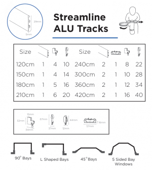 Our Streamline straight tracks come in eight sizes 120,150,180,200,240,300,360 and 420cm The track bends by hand due to it flexibility. The user friendly system makes installation quick and easy.